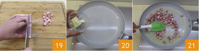 Now it's time to prepare the sauce: first, slice the ham into strips, then into cubes 19. Melt the butter in a very large pan 20 and brown the ham for a few seconds 21.