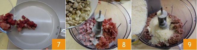 Melt the butter in a large pan then add both the pork loin and the veal chunks 7: brown for about 10 minutes or until the meat has released its juices. Let it cool. In a food processor add the prosciutto crudo mortadella and browned meat now at room temperature 8. Blend until you obtain a homogeneous mixture then add the Parmesan cheese 9,