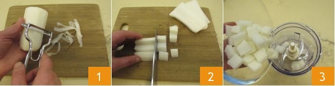 To prepare the tuna and avocado wraps with yogurt and daikon sauce, start with the yogurt and daikon sauce: peel the daikon 1, cut it into cubes 2, and then blend it into a puree 3.