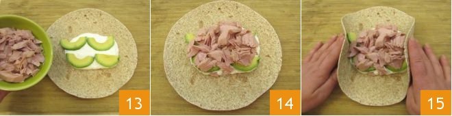 Take the tuna, drain it to avoid excess oil 13, and place it on top of the avocado and sauce, always in the center of the tortilla 14. At this point, you can proceed to close the tortilla, starting from the sides 15.