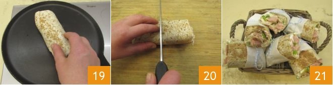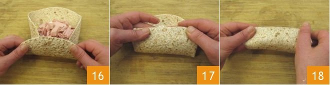 Fold the bottom side like an envelope 16, then roll the tortilla on itself 17, folding the edges inside to keep the filling from escaping 18. Repeat the same steps for the others.