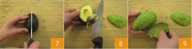 Take the avocado and cut it in half 7, remove the pit with the help of a knife, slicing it to extract it more easily 8, and peel it, if it is very ripe it will come off easily 9 otherwise you can cut the pulp and extract it with a teaspoon.