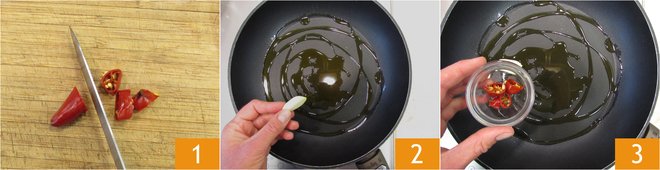 To prepare tuna and lemon pasta, you can start by boiling the pasta water and salting it once it's boiling. Then wash, trim, and chop the chili pepper into pieces 1; you can remove the seeds if you prefer. You can also finely chop it if you like. In a skillet, pour a drizzle of extra virgin olive oil, add the peeled garlic clove 2 and the fresh chili pepper 3. Sauté, stirring occasionally.