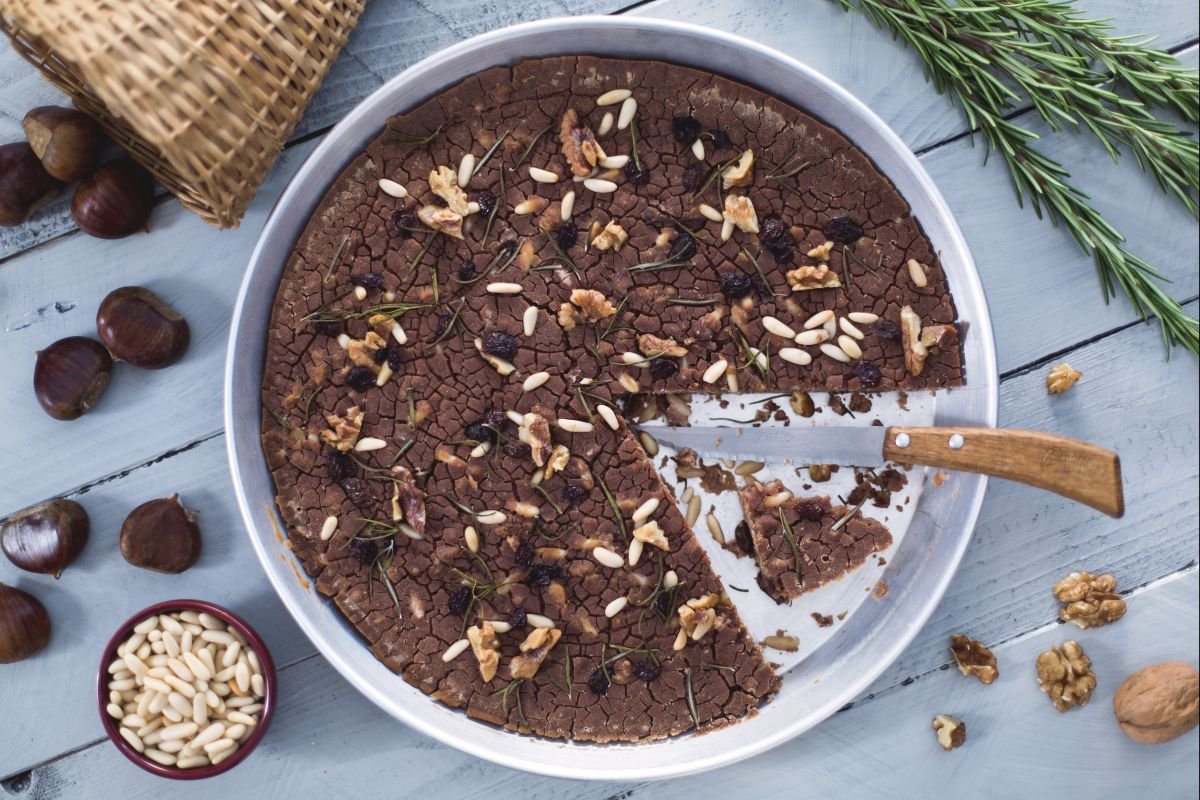 The castagnaccio, baldino or pattona chestnut cake is a traditional dessert made with chestnut flour and raisins, pine nuts, walnuts, and rosemary. It is difficult to determine its exact origin. We have made a Tuscan-style chestnut cake, but this recipe is also used in Veneto, Piedmont, and Lombardy, all regions in which the chestnut is a popularly used ingredient. All of its variations share the simple ingredients of chestnut cake itself: water, chestnut flour, and rosemary. Chestnuts were already so well-known and appreciated in the sixteenth century that an Augustinian priest discussed it in one of his writings. It seems that the creator of the chestnut cake was the Tuscan Pilade da Lucca, who is mentioned in the "Commentary of the most notable and monstrous things of Italy and other places" written by Ortensio Orlando, published in Venice in 1553. However, it was in the 19th century that the Tuscans exported the chestnut cake to the rest of Italy, and it was in this period that it was enhanced with raisins, pine nuts, and rosemary. Each family has its own chestnut cake recipe, but here we will share our version with you!