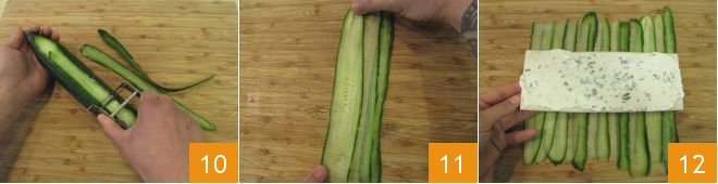 In the meantime, take the cucumber and slice it very thinly with a vegetable peeler 10; once you reach the seedier central part, turn the cucumber and continue slicing from the opposite side. Arrange the obtained slices on a cutting board side by side, slightly overlapping 11. Place a slice of bread in the center, opposite to the direction of the cucumber slices, and spread it with a tablespoon of yogurt sauce 12,