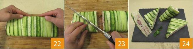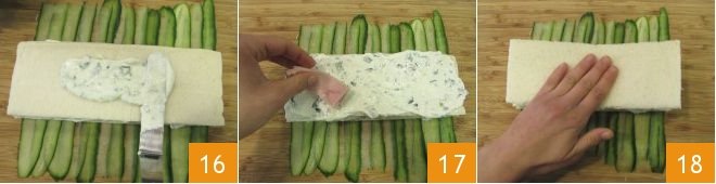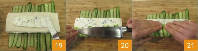 Spread a final layer of sauce on top 19, then lift the cucumber slices that hang off the side with the help of a knife blade 20 and gently wrap them around the bread to cover it 21.