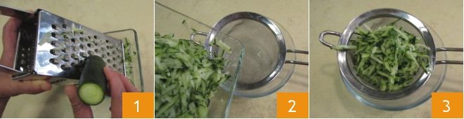 To prepare the tzatziki sauce, first wash and remove the seeds from the cucumber, if present. Then grate the cucumber with a coarse grater, without removing the peel 1. Transfer the grated cucumber to a strainer placed over a bowl 2 and let it rest for at least an hour, so that it loses its vegetation water 3.