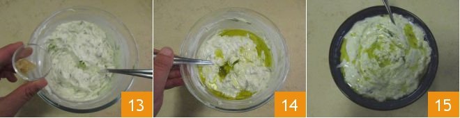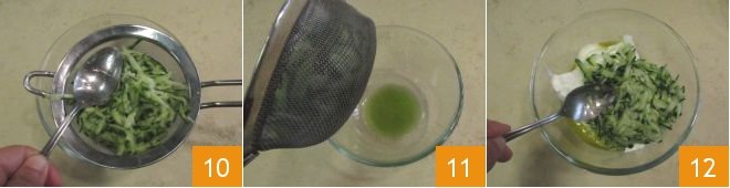 Now squeeze the cucumber pressing with the back of a spoon 10 to eliminate all the vegetation water 11 and add it to the yogurt 12.