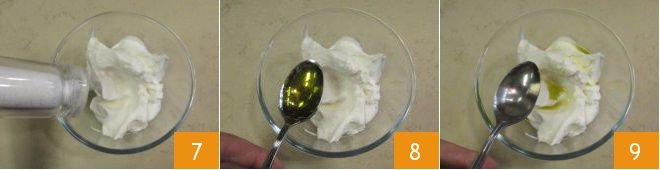 Pour the yogurt into a bowl, adjust with salt 7 and add the oil 8 and the vinegar 9, alternating between them, then mix well.