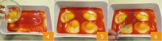 Now add one egg at a time 4 to the pan. We recommend breaking the egg into a small bowl first to make sure you keep the yolk intact. Arrange the 4 eggs side by side 5 and spread the remaining tomato puree 6 over the top, seasoning with salt and pepper.