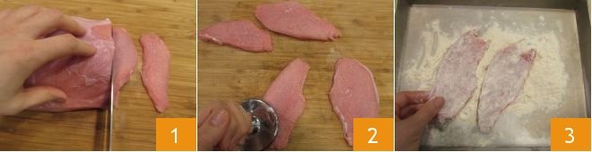 To make the scaloppine with mushrooms, cut the top round veal into slices 1, then pound them with a meat tenderizer to make them thinner 2, flour the veal slices on both sides 3 and then shake them to remove the excess flour.