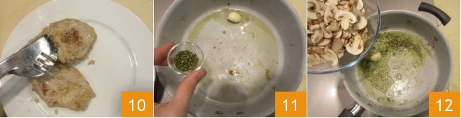 Once they are well browned, leave them to cool on a plate 10 and finish preparing the mushrooms: in the same pan you cooked the meat in, melt the other half of the butter, season with the whole clove of garlic and the chopped rosemary 11, add the sliced mushrooms 12 and sauté over medium heat for two minutes, then salt and pepper to taste.