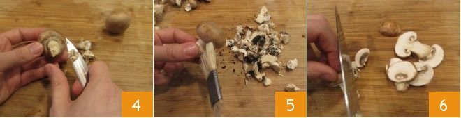 Now clean the mushrooms: using a sharp knife with a smooth blade begin by removing the earthy part on the stalk, scraping it gently until all traces of soil are removed 4. If the mushroom is clean enough, remove the scant earth residue with a brush 5 or a cotton cloth, do not wash them with water to avoid ruining them. Slice the mushrooms 6 and set them aside.