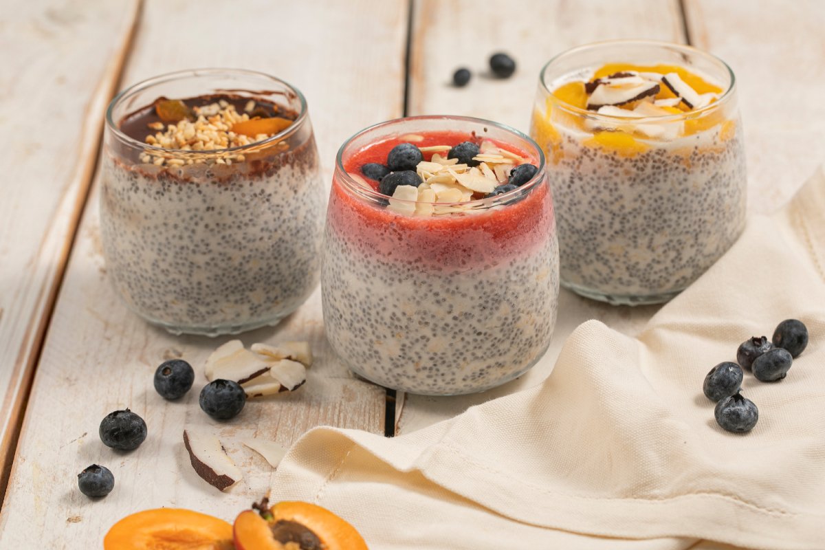 But what does “overnight” mean? Literally “during the night”: oats, chia seeds, yogurt, and plant-based milk are mixed and left to rest in the fridge for several hours, becoming creamy and soft, ready to be served in the morning.