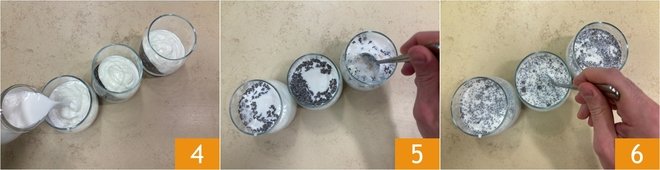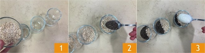 To prepare the vegan porridge, first, get 3 small glasses or bowls with a capacity of about 1.9 cups. Pour 1/2 cup (about 1.8 oz) of oats in each 1, a tablespoon of chia seeds 2, and a tablespoon of soy yogurt 3.