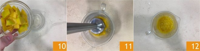 Now do the same with the mango: peel it and cut it into cubes, then transfer half of it into a tall and narrow container 11 and blend until you get a smooth puree 12. Set aside the cubes for decoration.