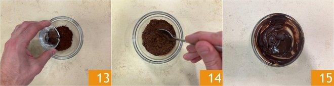 Proceed with the cocoa topping: in a small bowl, pour the cocoa and water 13, add the maple syrup, and mix with a teaspoon 14 until you obtain a smooth sauce 15.