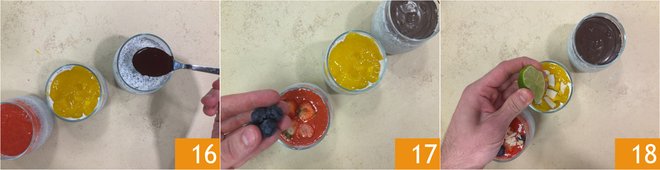Complete each glass with a different topping 16. Garnish the strawberry one with strawberry pieces, blueberries, and almond slices 17. For the mango one, garnish with dehydrated coconut cubes, mango pieces, and a few drops of lime 18.