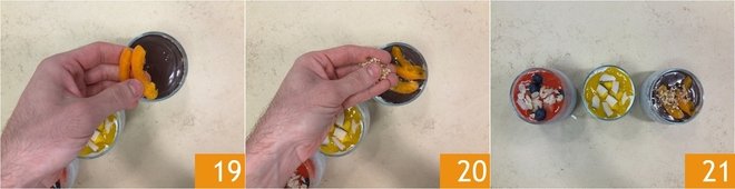 Finally, wash the apricot and cut it into slices, then place them on the cocoa porridge 19 and garnish with hazelnut crumbs 20. Your vegan porridge is ready; you just have to choose your favorite flavor 21!