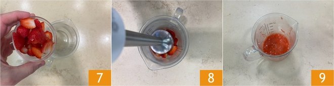 After the resting time, you can prepare the toppings. Place about half of the strawberries, stems removed and cut into pieces, in a tall and narrow container 7, then blend with an immersion blender 8 until you get a smooth cream 9.
