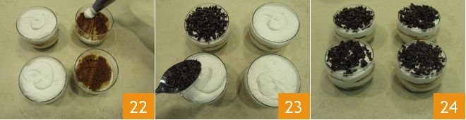 Retrieve your pastry bag from the refrigerator and create a first layer of cream 19; continue by placing another layer of sponge cake 20 and pour another teaspoon of coffee 21.