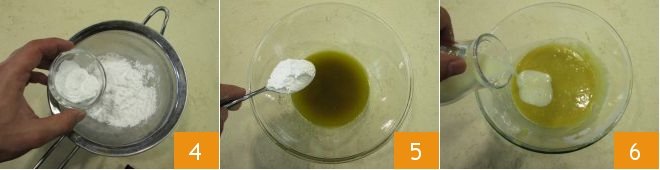 To prepare the vegan tiramisu, start by making the base. Pour olive oil into a bowl, add brown sugar 1, and mix until almost completely dissolved 2. In a separate bowl, sift the flour and cornstarch 3.