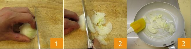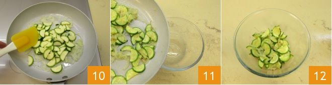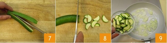 Trim the zucchini and cut it in half lengthwise 7; slice each half into thin slices 8. Add the zucchini to the pan only when the onions are translucent 9,