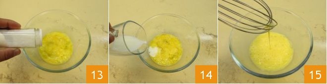 Prepare the omelette: in a bowl, break the eggs, add a pinch of salt 13 then add the milk 14 and mix everything with a hand whisk until the mixture forms a ribbon when lifting the whisk 15.