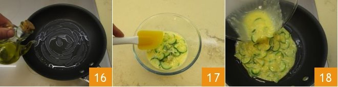 In a pan, heat the remaining oil 16; when the zucchini has slightly cooled, add them to the egg and milk mixture 17, stir and pour the egg mixture into the hot oil pan 18.