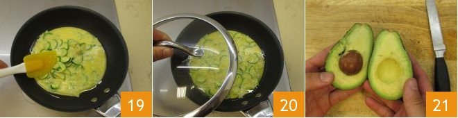 If the zucchini is too clustered in the center, move them only at the beginning with a spatula to redistribute them 19. Then cook over very low heat and cover with a lid 20; this way the omelette will cook both above and below, but the surface will remain very soft and a bit moist. If you see it setting quickly, you can remove it from the heat and put it back on at intervals while preparing the remaining ingredients. Cut the avocado in half 21,