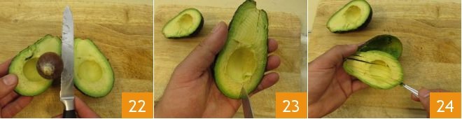 then remove the pit 22, score the flesh with a knife to create regular strips 23, then scoop out the entire inner edge 24 to extract the flesh more easily (do this at the time of serving to avoid oxidation).