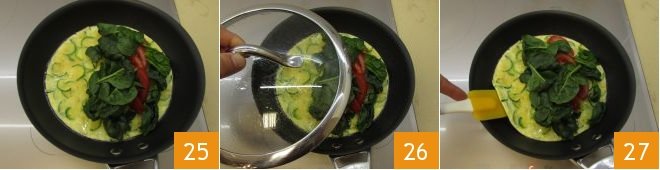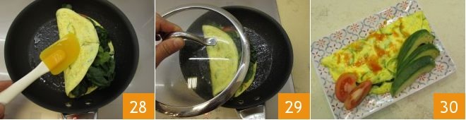 In a few minutes, your vegetable omelette will be ready as a base and still "runny" on the surface; you can then place the sliced vine-ripened tomato and spinach leaves on one half 25.
