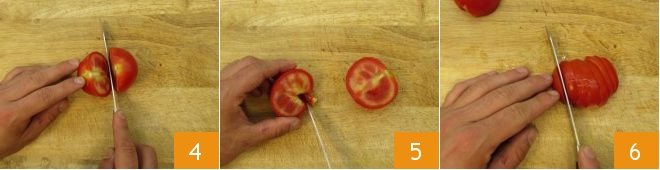 Meanwhile, take the vine-ripened tomato (not overly ripe), cut it in half 4, remove the stem by cutting around the green part 5, then slice it without separating the slices 6.