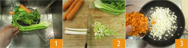 To make the vegetable bouillon cubes, start by washing the carrots, celery, and leek 1. Next, cut the vegetables, including the peeled onion, into fairly small cubes 2, and then move to the stove. Place the onion and carrot in a nonstick frying pan 3.