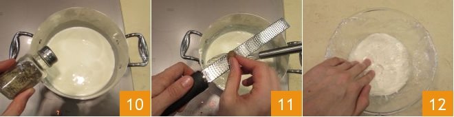 Season your béchamel with a pinch of pepper 10, salt, a grating of nutmeg 11 and continue cooking, always stirring for 5-6 minutes, until it reaches the right density. At this point, transfer the béchamel into a bowl and cover with plastic wrap touching the surface 12.