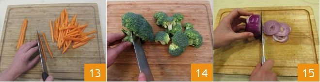 Wash all the vegetables and start cutting them. The carrots should be peeled and cut into julienne 13, for the broccoli only the florets are needed 14, and the onion should be finely sliced 15.