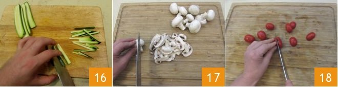 Trim the zucchinis and cut them into julienne as well 16. Clean the mushrooms, slice them 17 and also cut the cherry tomatoes in half 18.
