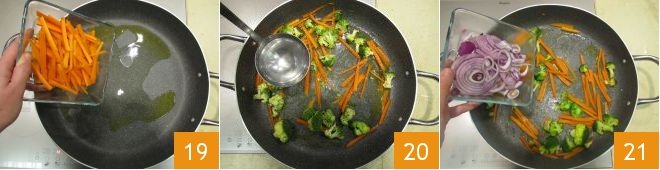 Once all the vegetables are prepared, pour the oil into a pan and first add the carrots 19, cook for a couple of minutes and then add the broccoli too. Deglaze with a bit of water 20, cover with a lid and let cook for 3-4 minutes. At this point, also add the onions 21