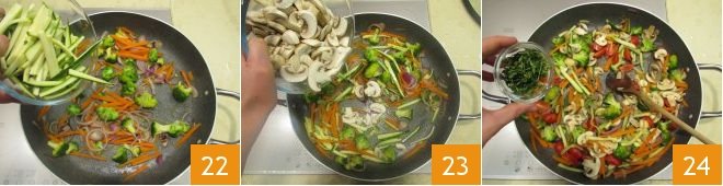 and then the zucchinis 22 and mushrooms 23. Let the vegetables cook, stirring occasionally, and only when they are cooked, season with salt and pepper, then turn off the heat and add cherry tomatoes and thyme 24.