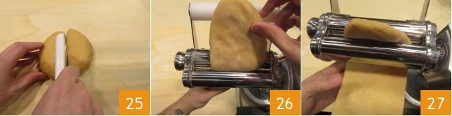 By now your egg dough will have rested, take the dough, divide it in half 25, and roll it out with a pasta machine 26. Go over it, reducing the thickness each time 27