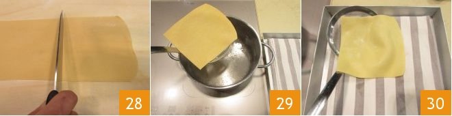 until you reach a thickness of about 0.08 inches. Once you have the sheets, make sure to cut out 8 rectangles measuring 6x8 inches 28. At this point, blanch them for 1 minute in slightly salted boiling water 29, drain them and place them on a tray lined with a kitchen towel 30. If you prefer, you can quickly pass the pasta sheets through a bowl with cold water to stop the cooking, then spread the rectangles again on a clean dish towel, but the important thing will be to lay out the various rectangles well stretched out and without overlapping.