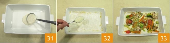 Once the pasta is cooked, take a baking dish 12x8 inches, add 2 or 3 tablespoons of béchamel 31 and spread it over the entire surface of the dish. Place 2 rectangles of pasta, side by side, cover with more béchamel, sprinkle with grated cheese 32 and place 1/3 of the vegetables 33.