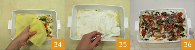 Cover with another two sheets of pasta 34 and proceed in this way for two more layers, until all the ingredients are used up. When you get to the last layer of béchamel 35, sprinkle with more grated cheese, cover with the vegetables and bake in a preheated conventional oven at 350°F for 20 minutes, then turn on the grill and cook for another 5 minutes. Take your vegetarian lasagna out of the oven 36 and serve it while still hot.