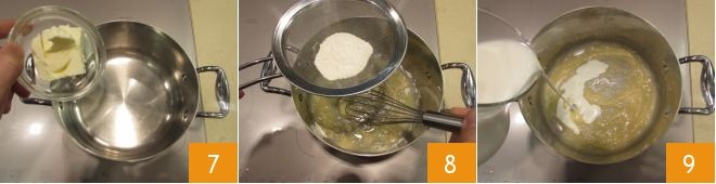 In the meantime, take care of preparing the béchamel. Pour the butter into a saucepan 7, let it melt gently then add the sifted flour, stirring quickly 8. Once you've got a hazelnut-colored roux, add the boiling milk 9 and stir again.