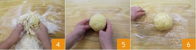 At this point, transfer the mixture onto a pastry board and work it 4, adding the flour kept aside as needed, until you get a smooth, firm, and elastic dough which you will shape into a sphere 5. Wrap it in food wrap 6 and let it rest for about 30-60 minutes outside the fridge in a cool and dry place.