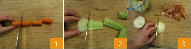 To vitello tonnato (prepare cold veal with tuna sauce), start by cleaning the vegetables you'll need to cook the meat. Wash them, peel and tip the carrot, then cut it into pieces 1. Tip the celery and cut it into pieces too 2. Peel the onion and cut it in half 3. Place the ingredients in a bowl and add the whole peeled garlic.