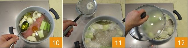 Add the white wine 7 and the water, which should cover all the ingredients 8. Add two pinches of salt 9