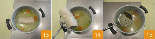 Once you have cooked the meat cut 13, drain it and leave it to cool thoroughly 14. Then remove the laurel, pepper and cloves 15.