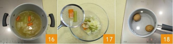 Take 1/3 of the resulting broth, simmer and reduce it on a high flame for around ten minutes. The leftover meat broth will be useful for other preparations, like risottos 16; once cooked, drain the vegetables in a container 17. Now prepare the boiled eggs. Place the eggs in a saucepan with abundant cold water. Switch on the stove and as soon as the water comes to the boil, set the timer to 9 minutes 18.