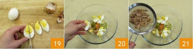 When boiled, drain the eggs and rinse them in cold water. Peel them once cooled and cut them into 4 pieces 19. Add the egg slices to the bowl with the vegetables 20. Add the drained tuna too 21,